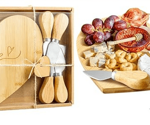 Bamboo Heart Shaped Design evoking a rustic farmhouse charm. Each cheese board measures approx. 6.9 x 8.3 x 0.4 inches. Packaged in an attractive kraft paper box. Each set is complemented by a 4 piece cheese knife set.