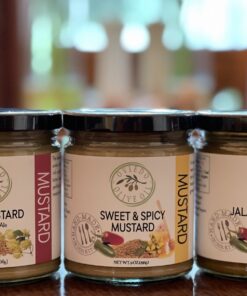 Peach Bourbon Jam, Blackberry-Raspberry Cardamom Jam, Strawberry Vanilla, Hot 7 Pepper Jam, Onion Balsamic Jam, Fig Jam Apricot Jalapeno Jam & Jalapeno Whiskey Mustard, Amber Beer Mustard, Sweet & Spicy Mustard